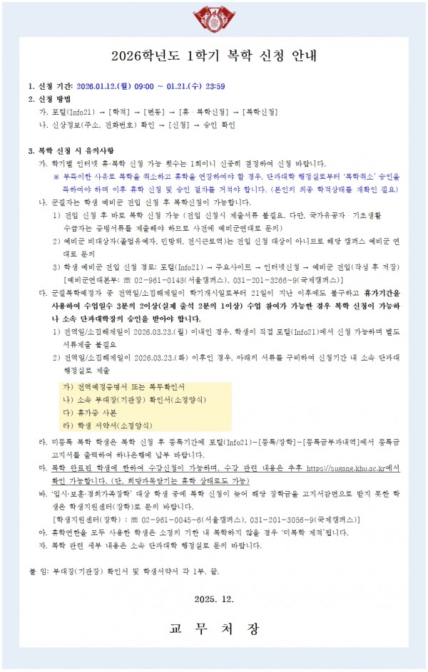 - 붙임1 2026-1학기 복학신청 안내문.hwp (196.0K) 8회 다운로드 | DATE : 2025-12-17 09:52:01