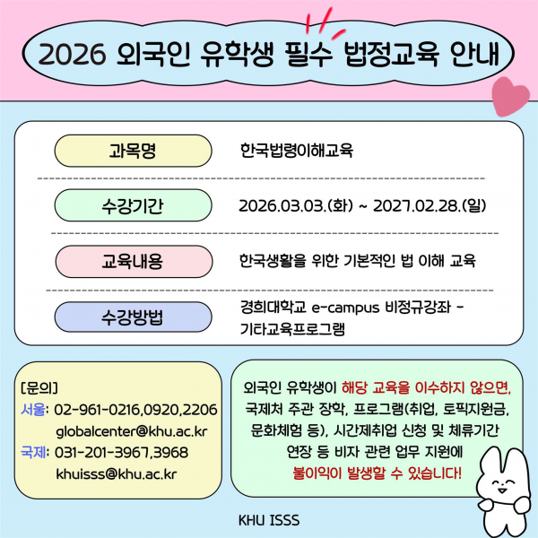 2027년 교육국제화역량인증제 대비 유학생 한국 법령 이해 교육 이수 안내 페이지 정보 작성자 체육대학 댓글 0건 조회 15회 작성일 2026-03-20 10:33 본문 첨부파일 2026 유학생 한국 법령 이해 교육 수강 매뉴얼.pdf (1.2M) 1회 다운로드 | DATE : 2026-03-20 10:33:54 목록 다음글2026학년도 1학기 계열별 교차 전공교과목 성적평가 선택제 신청 안내 26.03.05 댓글목록 댓글목록 등록된 댓글이 없습니다.