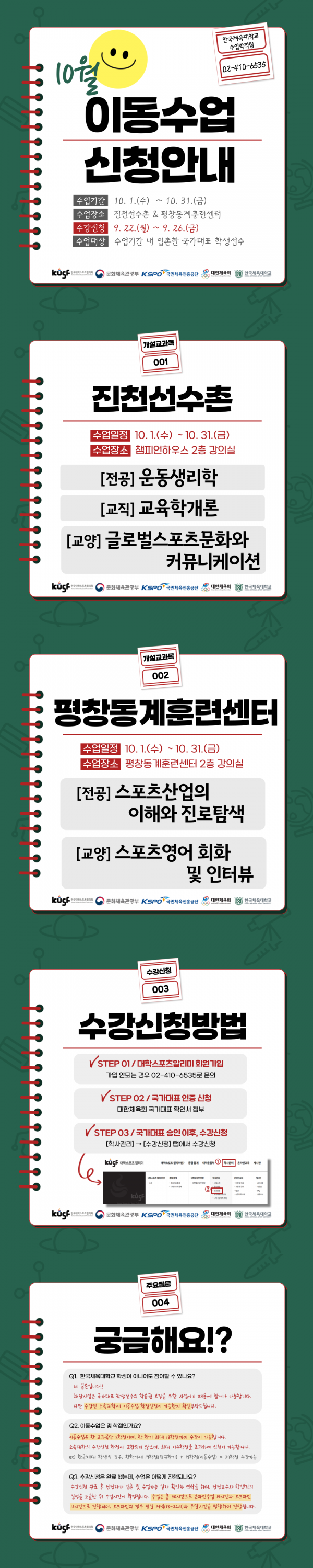 국가대표 대학 학생선수 이동수업(진천, 평창) 10월 수강신청 안내 페이지 정보 작성자 체육대학 댓글 0건 조회 11회 작성일 2025-09-29 15:07 본문 목록 이전글2025학년도 동계 해외전공연수 장학생 선발 공고(~10/17) 25.10.01 다음글2025-겨울학기 단기현장실습 시행 안내 25.09.29 댓글목록 댓글목록 등록된 댓글이 없습니다.