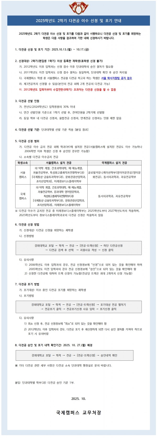 2025학년도 2학기 전공(본전공/다전공/부전공)·트랙 신청 및 포기 시행 안내