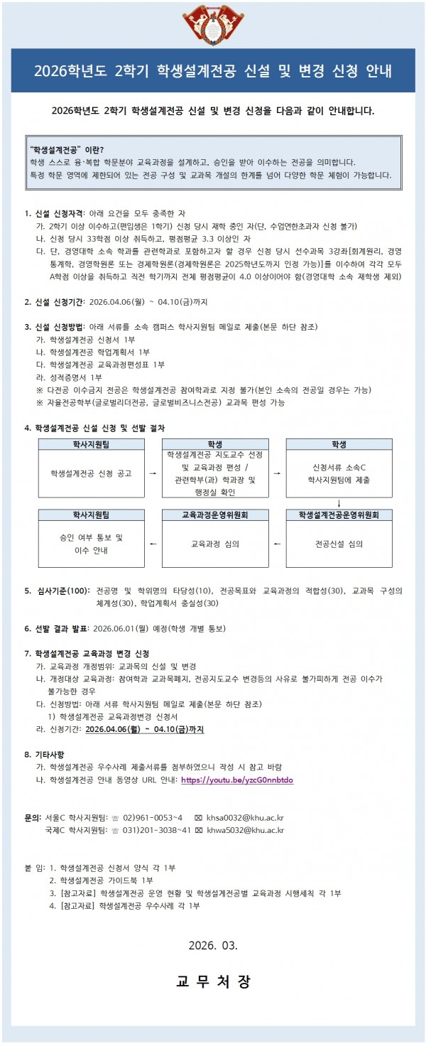 2026학년도 2학기 학생설계전공 신설 신청 및 변경 신청 시행 안내