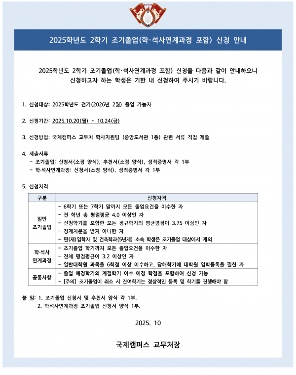 2025학년도 2학기 조기졸업(학·석사연계과정 포함) 신청 시행 안내(~10/24)