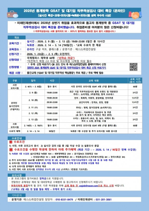 2025학년도 동계방학 GSAT 및 대기업 직무적성검사 대비 특강 프로그램 참여자 모집 안내(~2/5.12시) 페이지 정보 작성자 체육대학 댓글 0건 조회 15회 작성일 2026-01-23 14:40 본문 목록 다음글2025학년도 동계방학 취업실전 서류 대비반 Just Do It 프로그램 참여자 모집 안내(~2/5.15시)) 26.01.21 댓글목록 댓글목록 등록된 댓글이 없습니다.
