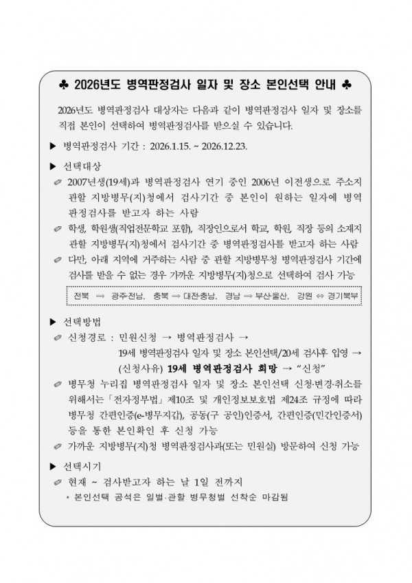 2026년도 병역판정검사 일자 및 장소 본인선택 안내 페이지 정보 작성자 체육대학 댓글 0건 조회 399회 작성일 2026-02-10 16:53 본문 목록 이전글2025 전기 졸업생 기부이벤트 26.02.20 다음글2026년 제1차 서울시 학자금대출이자 지원 사업 안내(~3/18. 18시) 26.02.09 댓글목록 댓글목록 등록된 댓글이 없습니다.