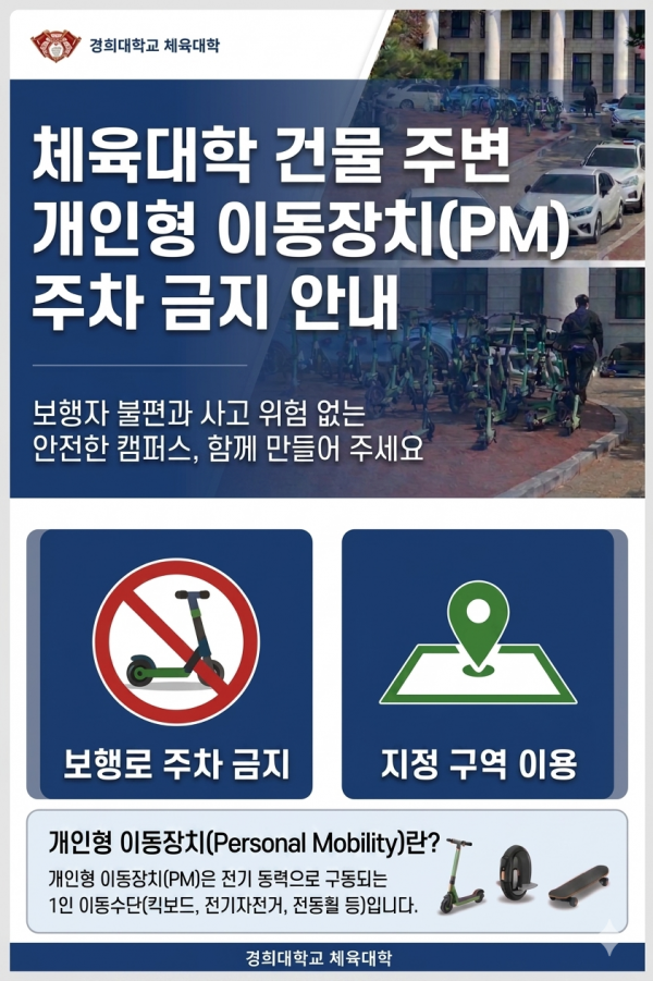 체육대학관 건물 주변 개인형 이동장치(PM) 주차 금지 안내 페이지 정보 작성자 체육대학 댓글 0건 조회 3회 작성일 2026-04-28 11:06 본문 목록 다음글2026 대한민국 상생 채용박람회 "바이오헬스관" 개최 안내 26.04.27 댓글목록 댓글목록 등록된 댓글이 없습니다.