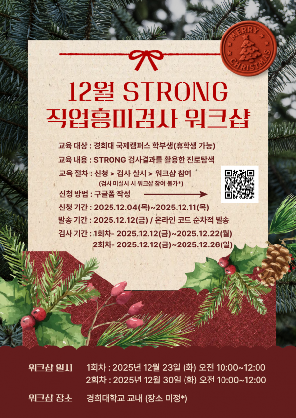 [Nexus][2025학년도 자기이해 및 적성 탐색을 위한 심리검사 및 워크숍 등 프로그램 운영 안내(~12/11) 페이지 정보 작성자 체육대학 댓글 0건 조회 116회 작성일 2025-12-09 09:12 본문 목록 이전글2025학년도 동계방학 글로벌 취업 대비 International Project(스펙 향상 심화과정) 참여자 모집 안내(~26.01.07) 25.12.10 다음글[2025 협업형 메이커 스페이스] 2025년 12월 KHU MAKERS 주경야조(晝耕夜造) 서포터즈 창업 특강 프로그램 참여자 모집 안내 25.12.08 댓글목록 댓글목록 등록된 댓글이 없습니다.