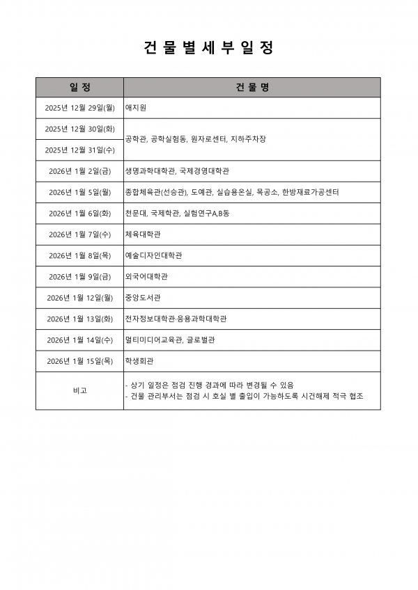 2025년도 소방시설 법적점검 일정 재공지(수정) 페이지 정보 작성자 체육대학 댓글 0건 조회 15회 작성일 2025-12-17 09:08 본문 목록 이전글2025년도 소방시설 법적점검 일정 재공지(체육대학2026.01.07) 25.12.17 다음글2025학년도 동계방학 「스포츠 분야별 취업 정보 파헤치기」 프로그램 참여자 모집 안내 25.12.16 댓글목록 댓글목록 등록된 댓글이 없습니다.