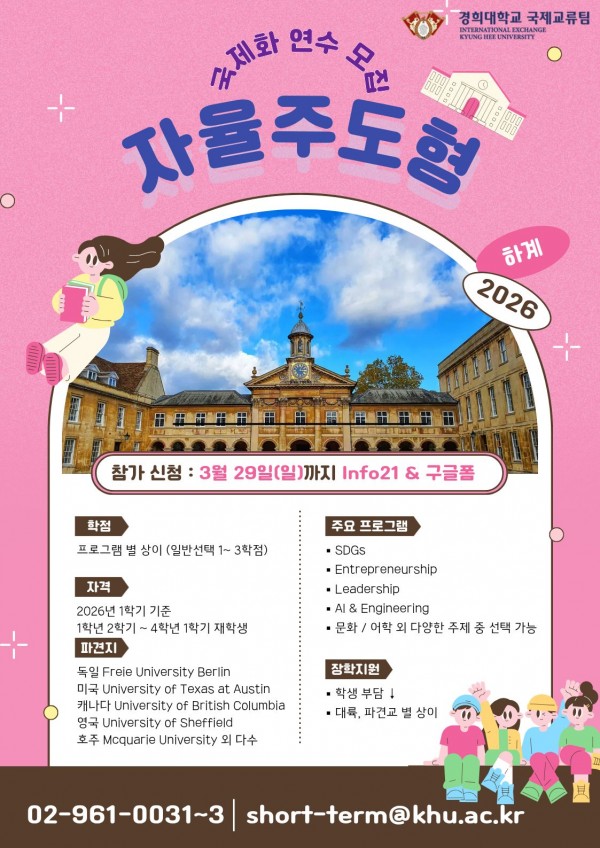 [국제처 국제교류팀] 2026년 하계 자율주도형 국제화연수 안내(~3/29)