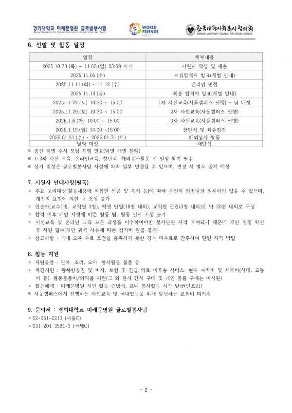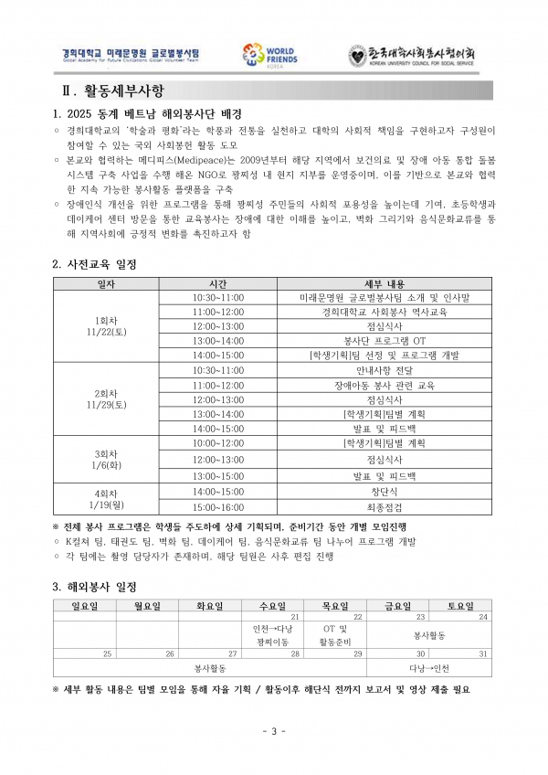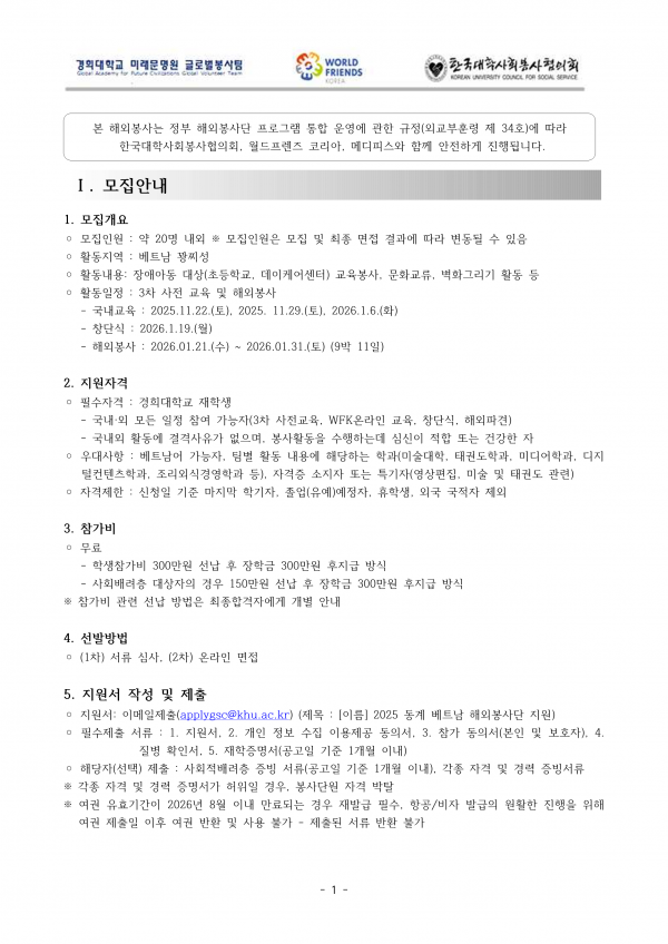 2025학년 동계 베트남 학생 해외봉사단 모집 안내(~11/2) 페이지 정보 작성자 체육대학 댓글 0건 조회 4회 작성일 2025-10-29 13:01 본문 첨부파일 2. [양식] 제출서류.zip (353.7K) 0회 다운로드 | DATE : 2025-10-29 13:01:28 목록 이전글2025학년도 2학기 '경희 K-MOOC 런치특강' 안내 25.10.29 다음글2026년 KUSF 대학스포츠 슬로건 공모전 진행 안내(~11/9) 25.10.28 댓글목록 댓글목록 등록된 댓글이 없습니다.