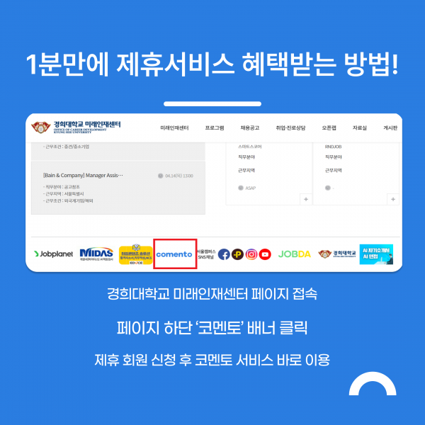 [미래인재센터] 코멘토(comento) 온라인 취업교육 통합 프로그램 안내 페이지 정보 작성자 체육대학 댓글 0건 조회 203회 작성일 2025-12-02 09:42 본문 목록 이전글[IR&A센터] 2025년 구성원 의식 및 만족도 조사 실시 안내(~12/19) 25.12.03 다음글「2025 세대·젠더 국민통합 컨퍼런스」개최 안내(~12/14) 25.11.26 댓글목록 댓글목록 등록된 댓글이 없습니다.