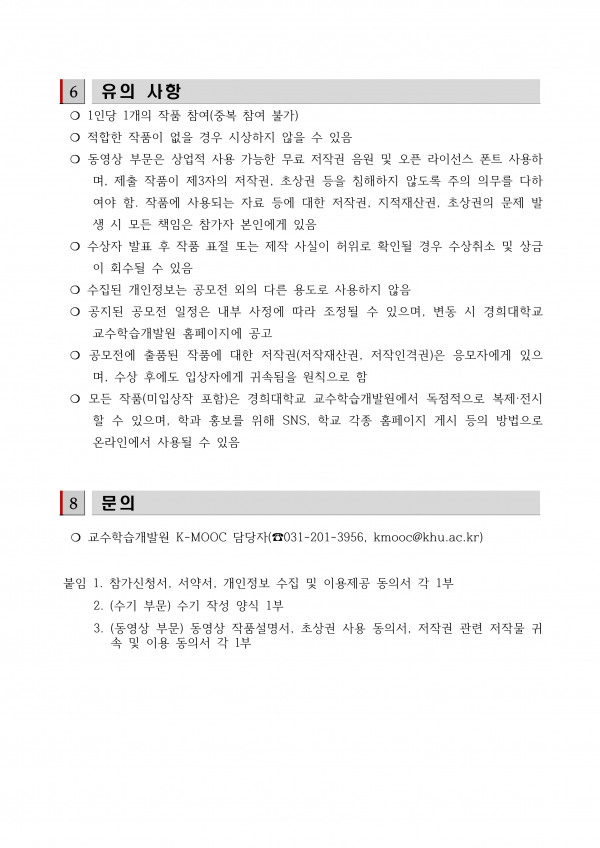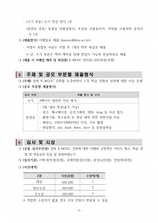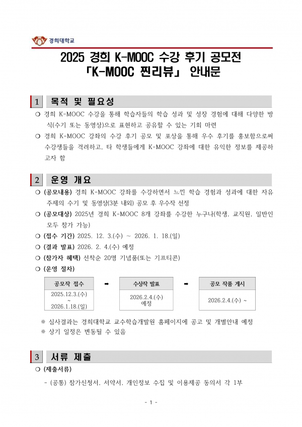 - 2. [수기 양식]「K-MOOC 찐리뷰 챌린지」경희 K-MOOC 수강후기 공모전.hwp (58.0K) 2회 다운로드 | DATE : 2025-12-08 09:45:20