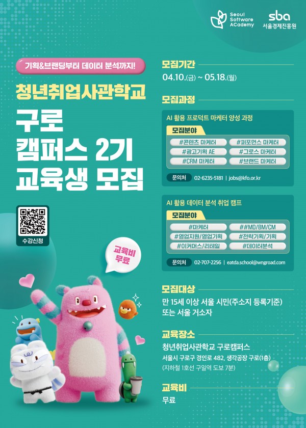 [청년취업사관학교 구로캠퍼스 2기 교육생 모집](~5/18) 페이지 정보 작성자 체육대학 댓글 0건 조회 10회 작성일 2026-04-10 09:53 본문 목록 이전글2026 학생선수/선수출신 대학생 진로탐색프로그램 1차 교육 모집 예정 안내(~4/19) 26.04.10 다음글[미래인재센터(국제)] 2026-1학기 Your Career Starter 포트폴리오 경진대회(~4/10) 26.04.08 댓글목록 댓글목록 등록된 댓글이 없습니다.