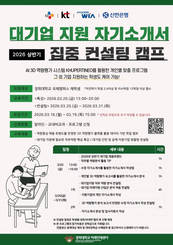 2026학년도 상반기 대기업 지원 자기소개서 집중 컨설팅 캠프 참여자 모집 안내(~3/19.15시) 페이지 정보 작성자 체육대학 댓글 0건 조회 7회 작성일 2026-03-17 15:39 본문 목록 이전글2025학년도 경희대학교 체육대학 해외 전공연수 발표회 안내(3/26(목) 18:00) 26.03.19 다음글2026학년도 1학기 대기업 및 공기업 직무적성검사 통합 특강 프로그램 참여자 모집 안내(~3/26.13시) 26.03.17 댓글목록 댓글목록 등록된 댓글이 없습니다.