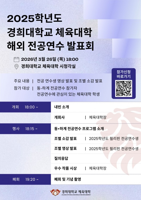 2025학년도 경희대학교 체육대학 해외 전공연수 발표회 안내(3/26(목) 18:00) 페이지 정보 작성자 체육대학 댓글 0건 조회 8회 작성일 2026-03-19 09:40 본문 목록 다음글2026학년도 상반기 대기업 지원 자기소개서 집중 컨설팅 캠프 참여자 모집 안내(~3/19.15시) 26.03.17 댓글목록 댓글목록 등록된 댓글이 없습니다.