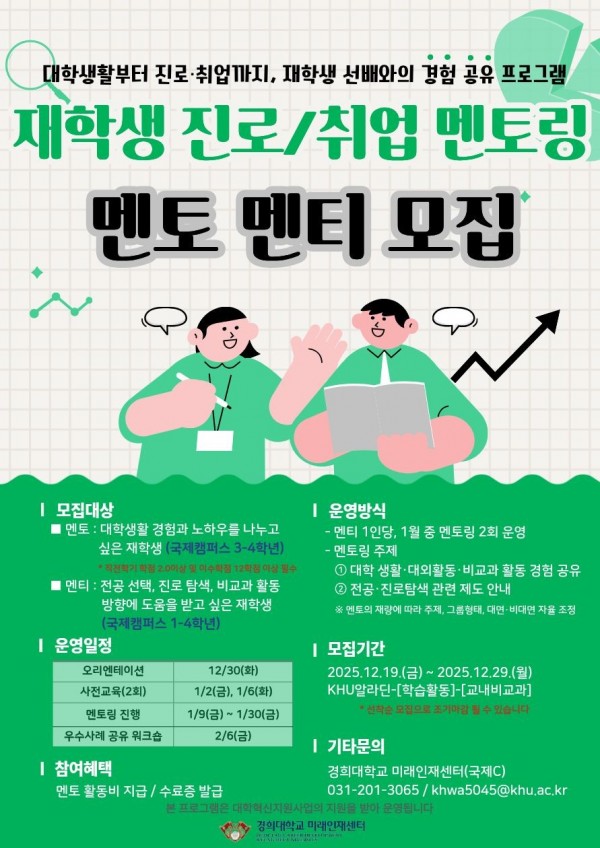 「재학생 진로/취업 멘토링」참여자 모집 안내(~12/29) 페이지 정보 작성자 체육대학 댓글 0건 조회 23회 작성일 2025-12-23 13:39 본문 목록 이전글[미래인재센터] 글로벌 역량 강화 교육 플랫폼 '링크드인 러닝 (Linkedin Learning)' 온라인 교육 수강권(3개월) 지원 25.12.23 다음글국제교육원 집중 영어강좌(LEAP) 안내(~1/09) 25.12.23 댓글목록 댓글목록 등록된 댓글이 없습니다.