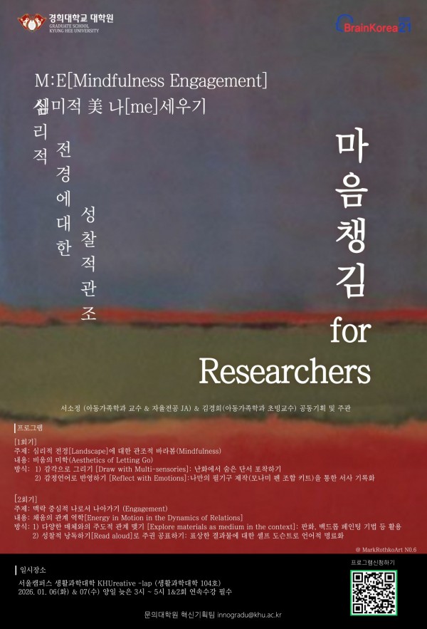마음 챙김 프로그램(2025-2) 안내 페이지 정보 작성자 체육대학 댓글 0건 조회 77회 작성일 2025-12-29 13:12 본문 첨부파일 붙임2. Khreative U KHU Care 마음챙김_기획안2025-2공유용.hwp (3.8M) 3회 다운로드 | DATE : 2025-12-29 13:13:18 목록 이전글2026년 서울청년정책네트워크 참여자 모집 안내(~1/23) 25.12.30 다음글2025학년도 동계방학 국제-서울 캠퍼스간 셔틀버스 임시 증차 안내 25.12.29 댓글목록 댓글목록 등록된 댓글이 없습니다.