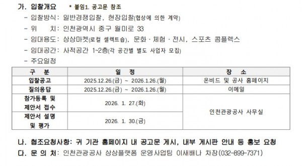 [인천관광공사] 상상플랫폼 1~2층 임대사업자 모집 안내(~1/26) 페이지 정보 작성자 체육대학 댓글 0건 조회 14회 작성일 2026-01-05 09:51 본문 첨부파일 붙임1. 공고문1관, 2관, 3관.zip (54.9K) 0회 다운로드 | DATE : 2026-01-05 09:52:26 목록 이전글[미래인재센터] 온라인 현직자 멘토링 '잇다(itdaa)' 안내 26.01.05 다음글2026년 서울청년정책네트워크 참여자 모집 안내(~1/23) 25.12.30 댓글목록 댓글목록 등록된 댓글이 없습니다.