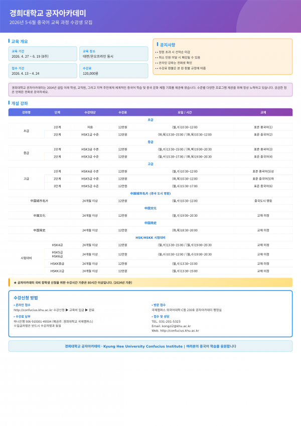 [공자아카데미] 5월-6월 중국어 교육과정 수강생 모집 안내(~4/24) 페이지 정보 작성자 체육대학 댓글 0건 조회 8회 작성일 2026-04-20 15:30 본문 목록 이전글[국제처 국제교류팀] 2026년 하계 SDGs 국제화연수 공고문(~4/26) 26.04.20 다음글2026학년도 2차 국제교육원 외국어강좌 안내(~4/29) 26.04.17 댓글목록 댓글목록 등록된 댓글이 없습니다.