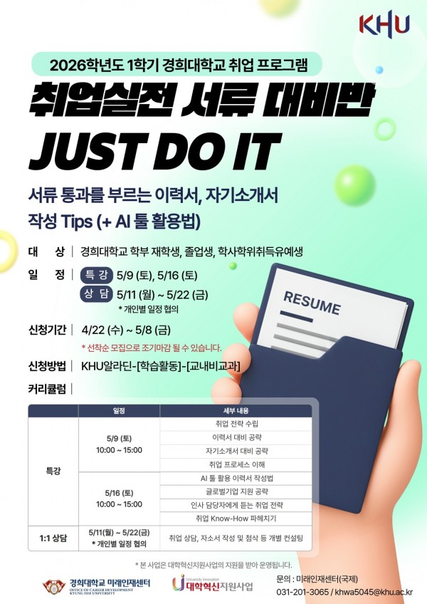 [미래인재센터(국제)] 2026학년도 1학기 취업실전 서류 대비반 Just Do It 프로그램 참여자 모집 안내(~5/8.16… 페이지 정보 작성자 체육대학 댓글 0건 조회 3회 작성일 2026-04-23 16:45 본문 목록 이전글[미래인재센터] 2026 상반기 동문 멘토와 함께하는 경희대학교 Job Festival 안내(~5/11) 26.04.23 다음글[미래인재센터(국제)]「대기업 인재상, 알면 취업이 쉬워진다」 특강 프로그램 참여자 모집 안내(~4/27) 26.04.23 댓글목록 댓글목록 등록된 댓글이 없습니다.