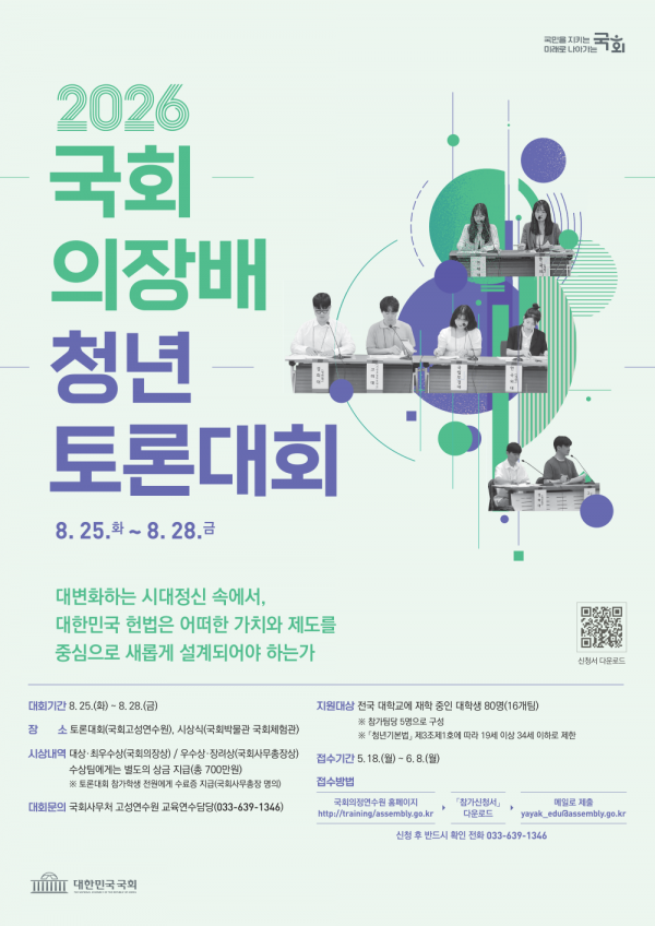 '2026년도 국회의장배 청년 토론대회' 실시 안내(~6/8) 페이지 정보 작성자 체육대학 댓글 0건 조회 4회 작성일 2026-04-23 17:21 본문 목록 다음글[미래인재센터] 2026 상반기 동문 멘토와 함께하는 경희대학교 Job Festival 안내(~5/11) 26.04.23 댓글목록 댓글목록 등록된 댓글이 없습니다.