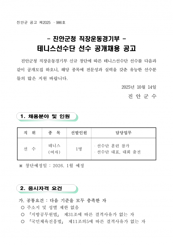 진안군청 직장운동경기부 테니스선수단 선수 공개채용(~10/24)
