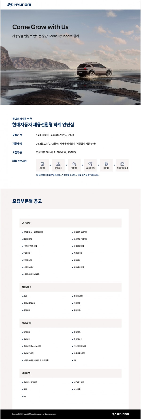 [현대자동차] 현대자동차 채용전환형 하계 인턴십 (~5/8.17시) 페이지 정보 작성자 체육대학 댓글 0건 조회 9회 작성일 2026-04-24 17:12 본문 ■ 지원방법 현대자동차 채용홈페이지 온라인 지원 https://zrr.kr/uTxGqM 목록 다음글[한국필립모리스] INKOMPASS 채용연계형 인턴 모집 안내(~5/3) 26.04.22 댓글목록 댓글목록 등록된 댓글이 없습니다.