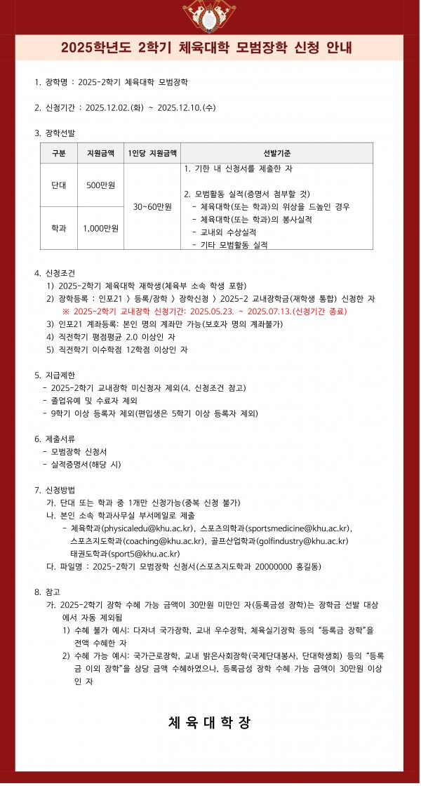 [체육대학] 2025-2학기 모범장학 신청 안내(~12/10)