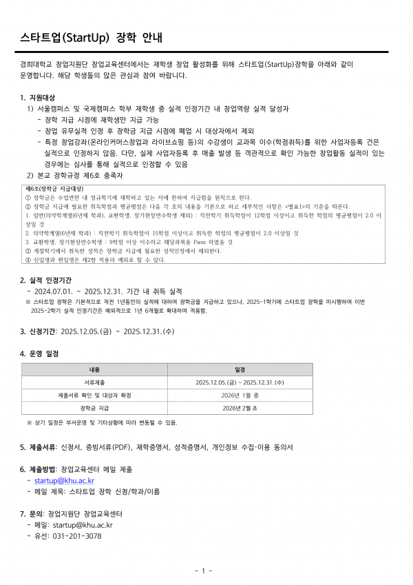 2025-2학기 스타트업 장학 안내(~12/31) 페이지 정보 작성자 체육대학 댓글 0건 조회 7회 작성일 2025-12-09 09:11 본문 첨부파일 2025-2학기 스타트업 장학 신청서.hwp (68.5K) 0회 다운로드 | DATE : 2025-12-09 09:11:12 목록 다음글[체육대학] 2025-2학기 모범장학 신청 안내(~12/10) 25.12.02 댓글목록 댓글목록 등록된 댓글이 없습니다.