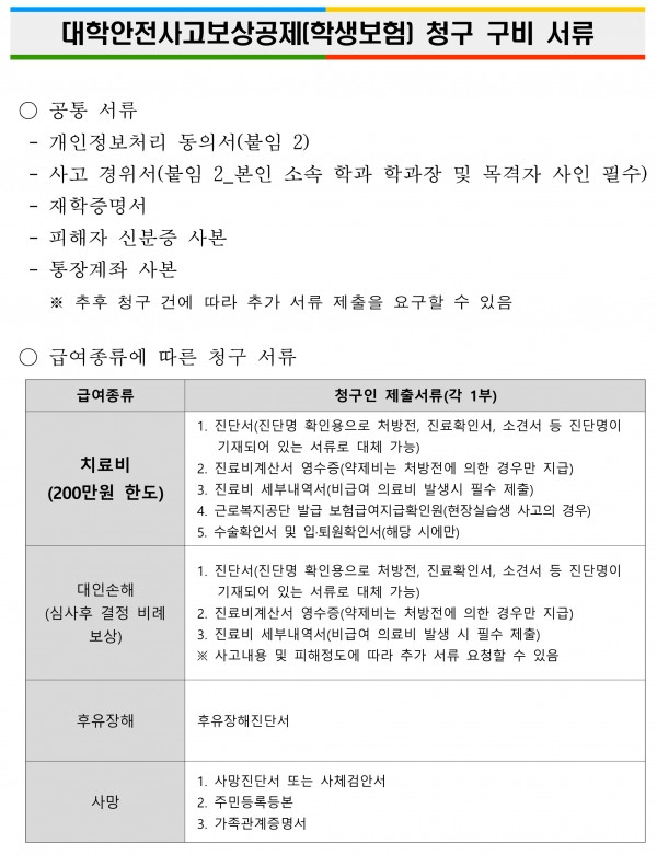 다. 보험 관련 문의사항은 체육대학 행정실(031-201-2701) 또는 총무팀(031-201-3101)으로 문의