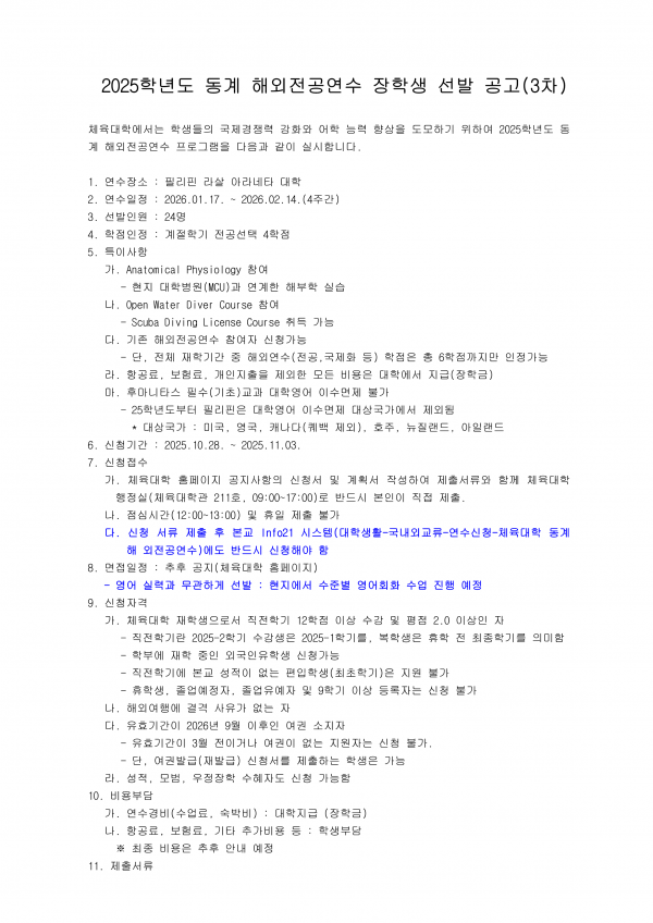 2025학년도 동계 해외전공연수 장학생 선발 공고(3차, ~11/3) 페이지 정보 작성자 체육대학 댓글 0건 조회 278회 작성일 2025-10-28 13:51 본문 첨부파일 2025 동계 해외전공연수 신청서 .hwp (35.5K) 5회 다운로드 | DATE : 2025-10-28 13:51:28 목록 이전글2026학년도 1학기 재입학 시행 안내(~11/17) 25.10.31 다음글국가대표 대학 학생선수 이동수업(진천, 평창) 11월 수강신청 안내 25.10.27 댓글목록 댓글목록 등록된 댓글이 없습니다.