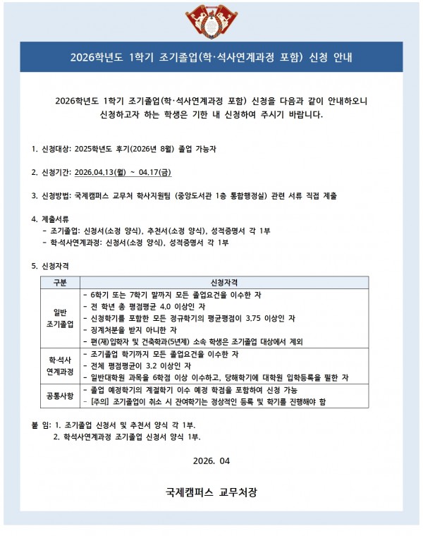 2026학년도 1학기 조기졸업(학·석사연계과정 포함) 신청 시행 안내