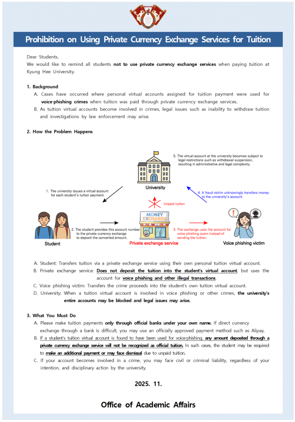 등록금 납부 시 사설환전소 이용 금지 안내 페이지 정보 작성자 체육대학 댓글 0건 조회 850회 작성일 2025-11-11 09:09 본문 목록 이전글2025-2학기 슬기로운 경희생활 시리즈 안내(교환학생/다전공/장학금/진로취업상담/학부연구생) 25.11.11 다음글교내 무인 증명서 발급기(키오스크) 운영 변경사항 안내 25.11.06 댓글목록 댓글목록 등록된 댓글이 없습니다.