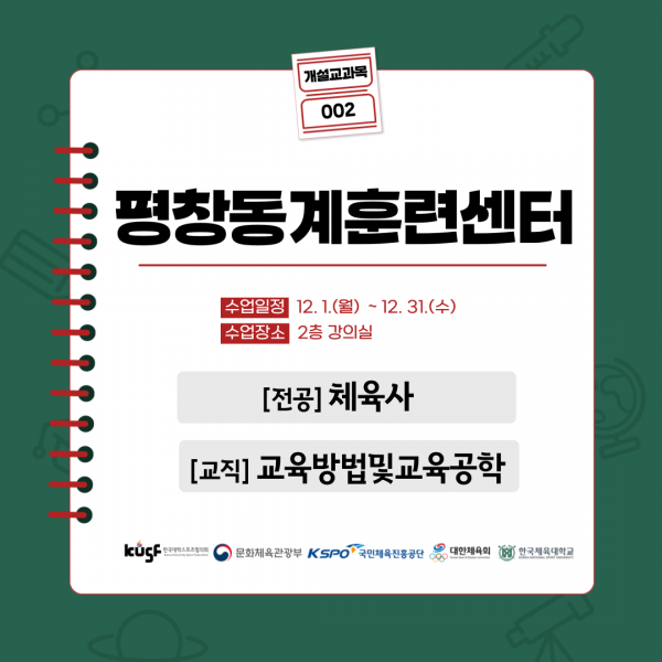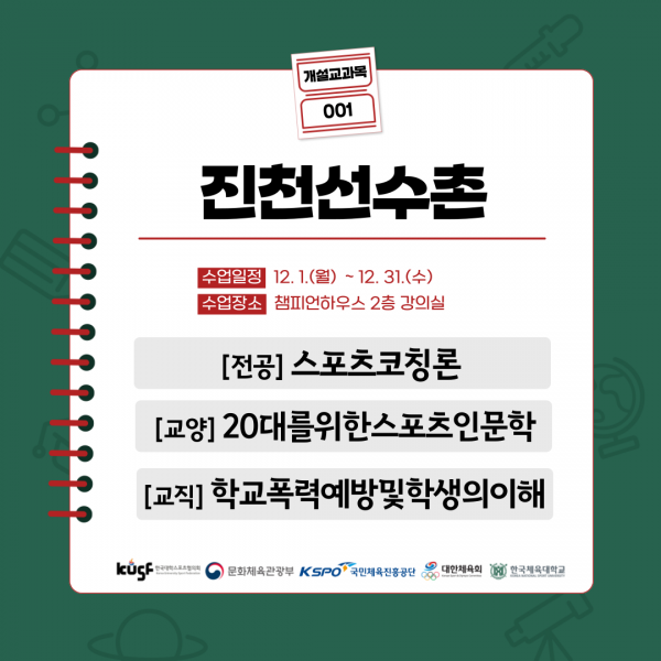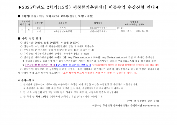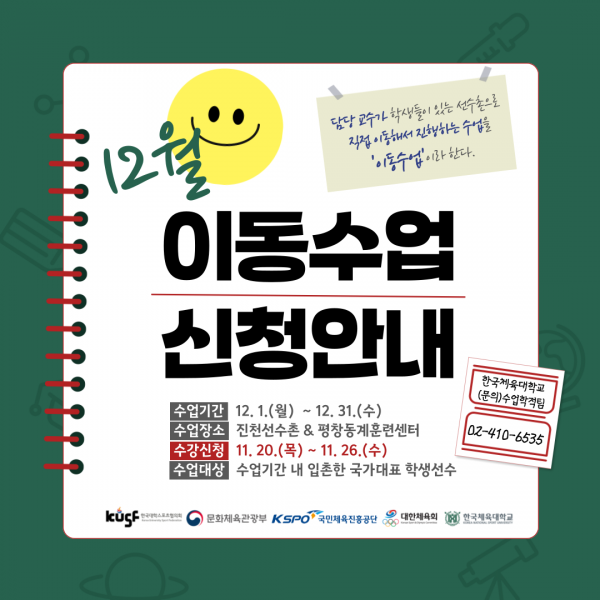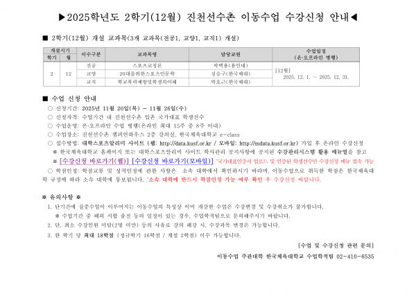 국가대표 대학 학생선수 이동수업(진천, 평창) 12월 수강신청 안내(~11/26)