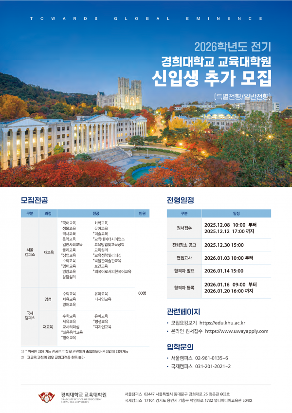[교육대학원] 2026학년도 전기 교육대학원 석사학위과정 신입생 추가모집 안내(~12/12)