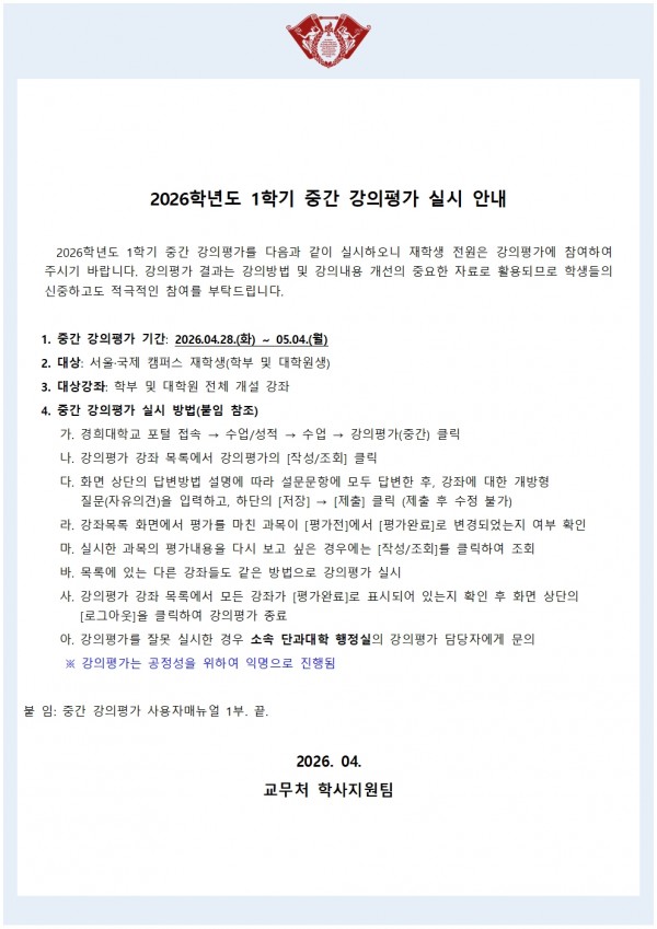 2026학년도 1학기 중간 강의평가 시행 안내 페이지 정보 작성자 체육대학 댓글 0건 조회 38회 작성일 2026-04-10 11:26 본문 첨부파일 붙임4_중간 강의평가 사용자매뉴얼학생용 1.pdf (289.3K) 0회 다운로드 | DATE : 2026-04-10 11:26:29 목록 다음글2026학년도 1학기 조기졸업(학·석사연계과정 포함) 신청 시행 안내 26.04.09 댓글목록 댓글목록 등록된 댓글이 없습니다.