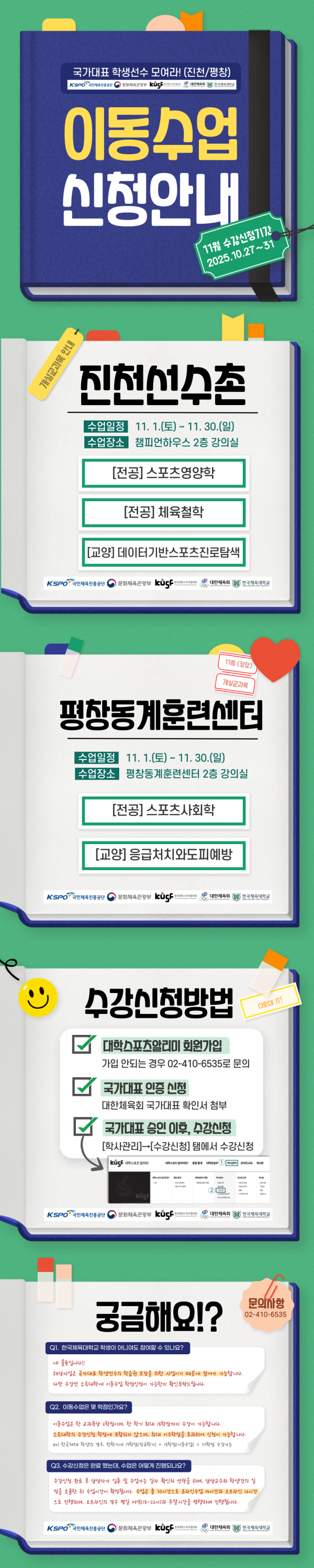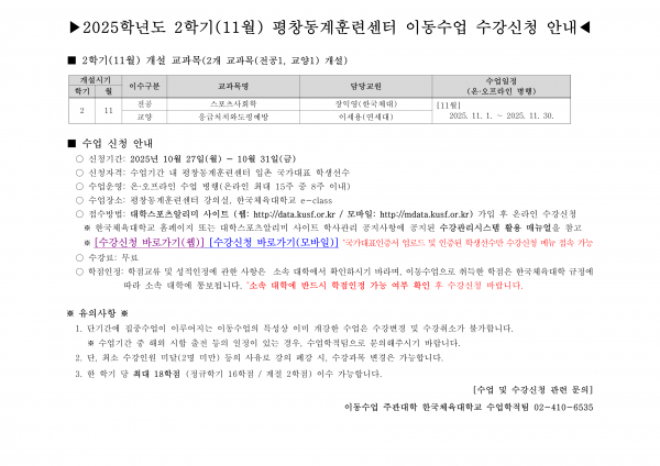 국가대표 대학 학생선수 이동수업(진천, 평창) 11월 수강신청 안내 페이지 정보 작성자 체육대학 댓글 0건 조회 63회 작성일 2025-10-27 17:25 본문 목록 이전글2025학년도 동계 해외전공연수 장학생 선발 공고(3차, ~11/3) 25.10.28 다음글[중요] 대학생 해외 취업 피해 예방을 위한 안내 25.10.24 댓글목록 댓글목록 등록된 댓글이 없습니다.