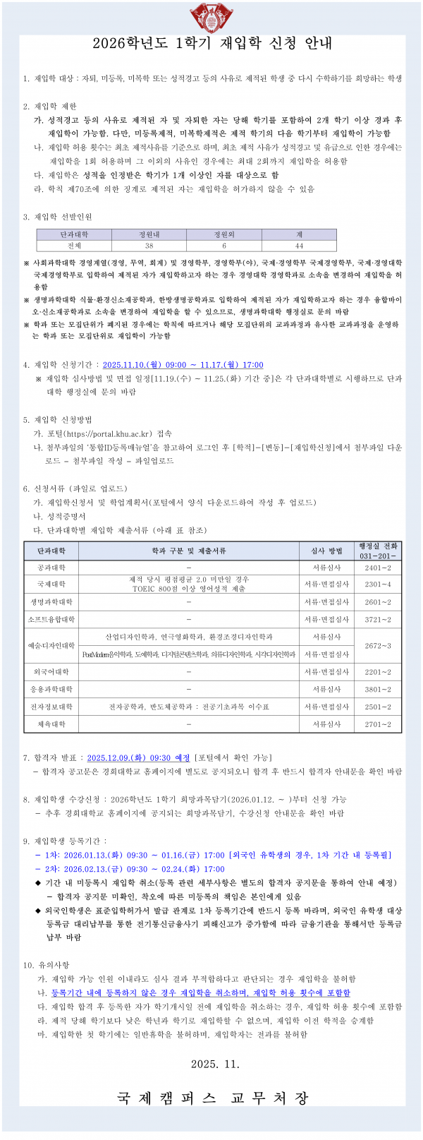 2026학년도 1학기 재입학 시행 안내(~11/17)