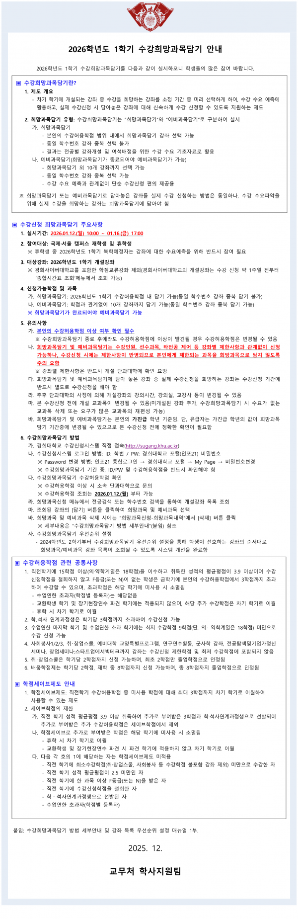 2026학년도 1학기 수강희망과목담기 안내 페이지 정보 작성자 체육대학 댓글 0건 조회 150회 작성일 2025-12-30 14:37 본문 첨부파일 붙임2_수강희망과목담기 방법 세부안내 및 강좌 목록 우선순위 설정 매뉴얼 1.pdf (1.1M) 5회 다운로드 | DATE : 2025-12-30 14:37:04 목록 다음글국가대표 대학 학생선수 이동수업(진천) 1월 계절학기 수강신청 안내 25.12.19 댓글목록 댓글목록 등록된 댓글이 없습니다.