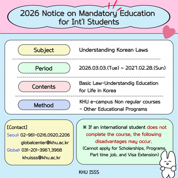 2027년 교육국제화역량인증제 대비 유학생 한국 법령 이해 교육 이수 안내 페이지 정보 작성자 체육대학 댓글 0건 조회 26회 작성일 2026-03-20 10:33 본문 첨부파일 2026 유학생 한국 법령 이해 교육 수강 매뉴얼.pdf (1.2M) 3회 다운로드 | DATE : 2026-03-20 10:33:54 목록 다음글2026학년도 1학기 계열별 교차 전공교과목 성적평가 선택제 신청 안내 26.03.05 댓글목록 댓글목록 등록된 댓글이 없습니다.