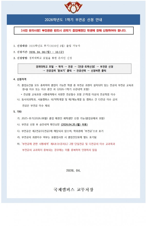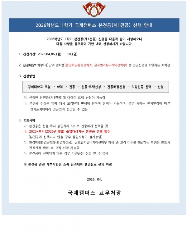 2026학년도 1학기 전공(본전공/다전공/부전공)·트랙 신청 및 포기 시행 안내