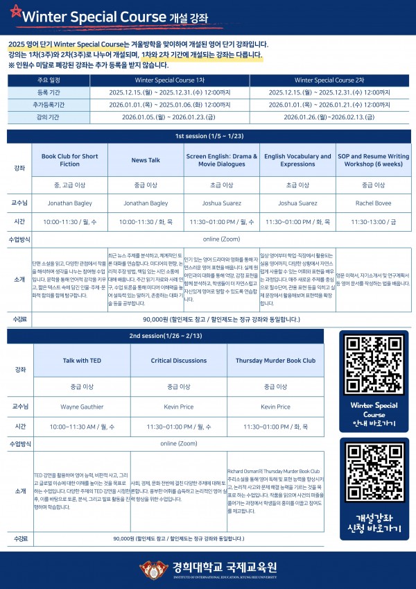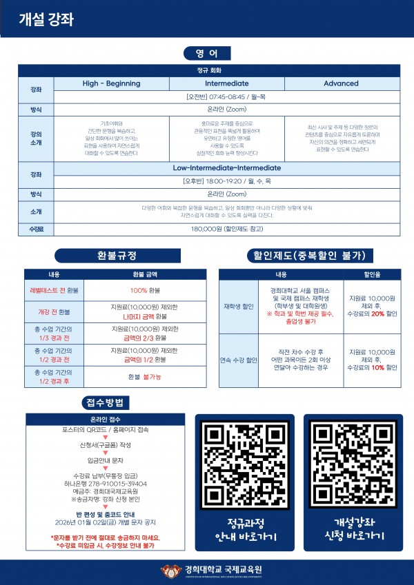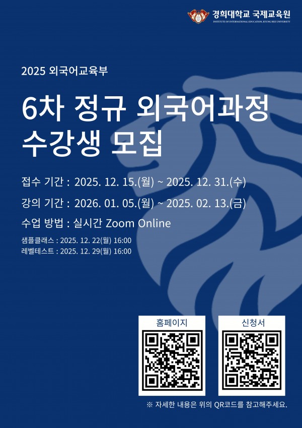 2025학년도 6차 국제교육원 외국어강좌 안내(~12/31) 페이지 정보 작성자 체육대학 댓글 0건 조회 21회 작성일 2025-12-17 09:14 본문 첨부파일 2025-6차 정규 외국어과정 안내 포스터 4.pdf (797.7K) 0회 다운로드 | DATE : 2025-12-17 09:14:15 목록 이전글AI 3D 역량평가 플랫폼 PERTINEO를 활용한 <2025 청년 채움 취업 프로젝트> 참여자 모집 안내(~1/09) 25.12.17 다음글2025년도 소방시설 법적점검 일정 재공지(체육대학2026.01.07) 25.12.17 댓글목록 댓글목록 등록된 댓글이 없습니다.