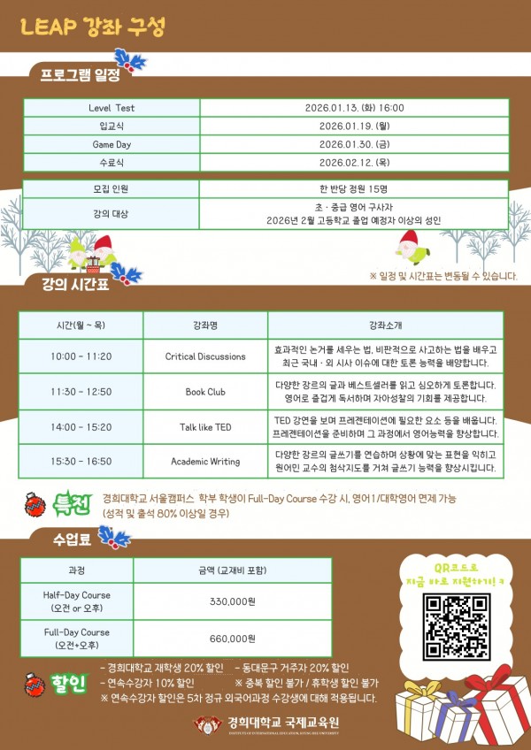 국제교육원 집중 영어강좌(LEAP) 안내 페이지 정보 작성자 체육대학 댓글 0건 조회 3회 작성일 2025-12-22 14:13 본문 목록 다음글경희대학교 국제캠퍼스 취업프로그램 홍보단 KHU Careers Editor 19기 참여자 모집 안내(~12/31.15시) 25.12.19 댓글목록 댓글목록 등록된 댓글이 없습니다.