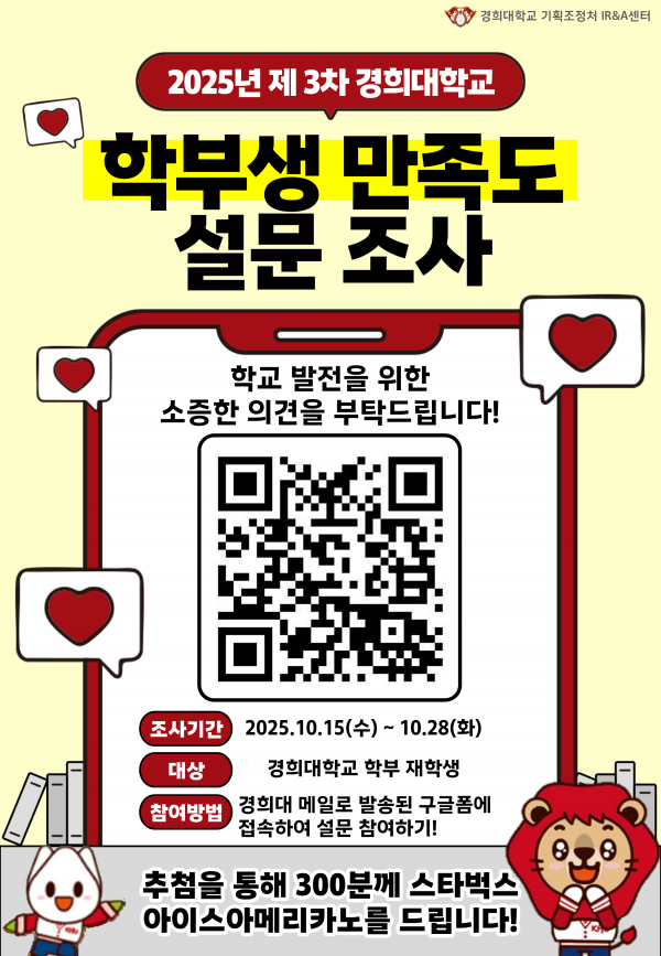 [IR&A센터] 2025학년도 제3차 학생 만족도 조사 안내(~10/28) 페이지 정보 작성자 체육대학 댓글 0건 조회 70회 작성일 2025-10-15 09:31 본문 목록 이전글[미래인재센터] AI 역량검사 취업지원 플랫폼 '잡다(JOBDA)' 서비스 안내 25.10.16 다음글경기도 '2025년 경기청년 역량강화 기회지원 사업' 안내(~12/4) 25.10.13 댓글목록 댓글목록 등록된 댓글이 없습니다.