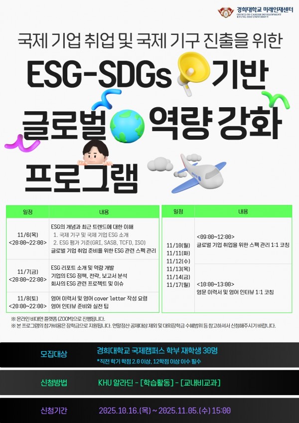 2025학년도 2학기 국제 기업 취업 및 국제 기구 진출을 위한 ESG-SDGs 기반 글로벌 역량 강화 프로그램 참여자 모집… 페이지 정보 작성자 체육대학 댓글 0건 조회 67회 작성일 2025-10-20 17:27 본문 목록 이전글대학운동부 학생선수 학사관리 현황 및 만족도 조사 안내(~10/22) 25.10.21 다음글[관리팀] 체육대학 복도 및 계단실 공사 안내(~11/21) 25.10.16 댓글목록 댓글목록 등록된 댓글이 없습니다.