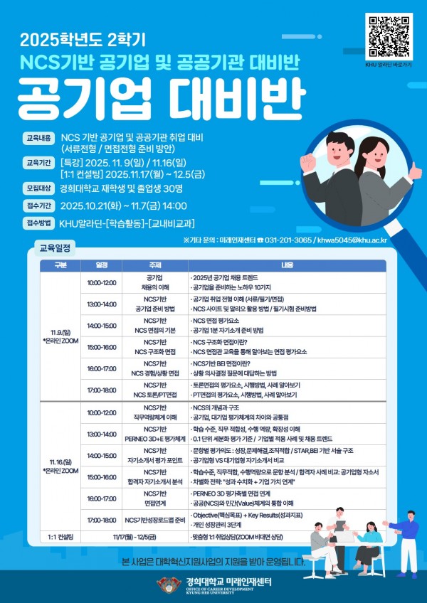2025학년도 2학기 NCS기반 공기업 대비반 참여자 모집 안내(~11/7) 페이지 정보 작성자 체육대학 댓글 0건 조회 65회 작성일 2025-10-23 10:24 본문 목록 이전글2025학년도 예술·디자인대학 콜로키움 「AI_AnD_Talk 2025」 개최 안내 25.10.23 다음글2025학년도 2학기 KHU-MAKERS 12기 주경야조(晝耕夜造) 학생 서포터즈 참여자 모집 안내(선착순) 25.10.22 댓글목록 댓글목록 등록된 댓글이 없습니다.