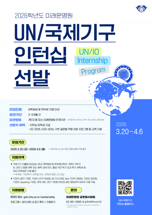 2026학년도 UN/국제기구 인턴십 및 유엔본부 한국대학생 대표단 선발 모집 안내 페이지 정보 작성자 체육대학 댓글 0건 조회 50회 작성일 2026-03-25 16:25 본문 목록 이전글국제캠퍼스 배리어프리맵 공모전 수상작 26.03.27 다음글2026년 대학혁신지원사업 학생기획단 모집 안내(~4/5) 26.03.25 댓글목록 댓글목록 등록된 댓글이 없습니다.