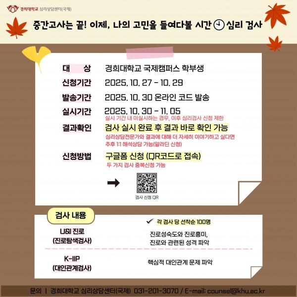 2025학년도 2학기「중간고사는 끝! 이제, 나의 고민을 들여다볼 시간」심리검사 안내(~10/29)