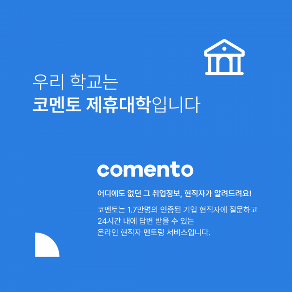 [미래인재센터] 코멘토(comento) 온라인 취업교육 통합 프로그램 안내 페이지 정보 작성자 체육대학 댓글 0건 조회 216회 작성일 2025-12-02 09:42 본문 목록 이전글[IR&A센터] 2025년 구성원 의식 및 만족도 조사 실시 안내(~12/19) 25.12.03 다음글「2025 세대·젠더 국민통합 컨퍼런스」개최 안내(~12/14) 25.11.26 댓글목록 댓글목록 등록된 댓글이 없습니다.