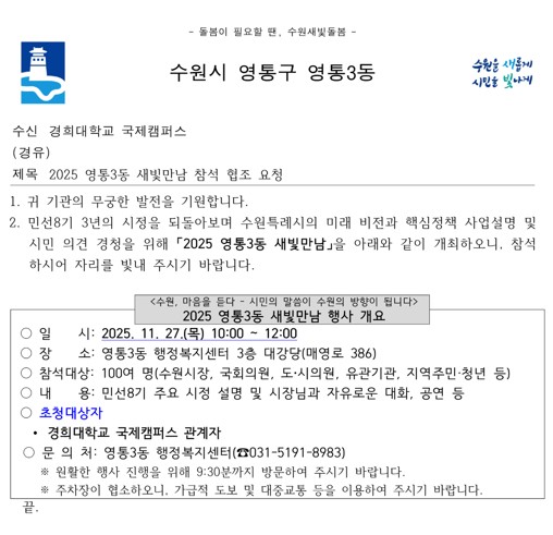 2025 영통3동 새빛만남 개최 안내(11/27 10:00 ~ 12:00) 페이지 정보 작성자 체육대학 댓글 0건 조회 39회 작성일 2025-11-04 13:55 본문 목록 이전글2025 경희 체육인의 밤(경희체대 동문회) 행사 안내(11/28) 25.11.05 다음글[미래인재센터] 한국가이던스 취업준비도 검사 서비스 안내 25.11.04 댓글목록 댓글목록 등록된 댓글이 없습니다.
