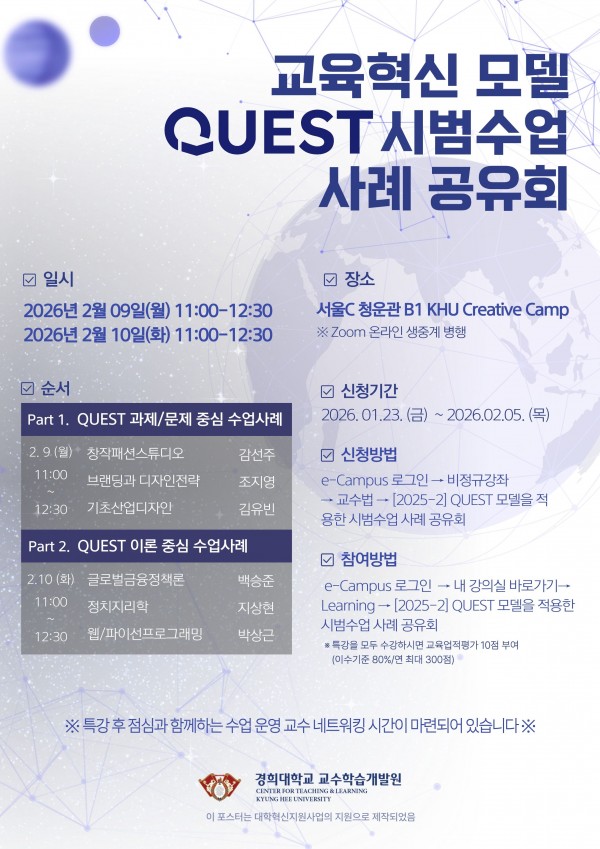 [QUEST 혁신수업] 수업운영 사례공유회 안내 페이지 정보 작성자 체육대학 댓글 0건 조회 237회 작성일 2026-02-04 13:04 본문 목록 이전글[인천관광공사] 상상플랫폼 1~2층 임대사업자 모집 공고(재공고) 26.02.04 다음글현직자 직무/직업 온라인강의 비투모로우(betomorrow) 서비스 안내 26.02.04 댓글목록 댓글목록 등록된 댓글이 없습니다.
